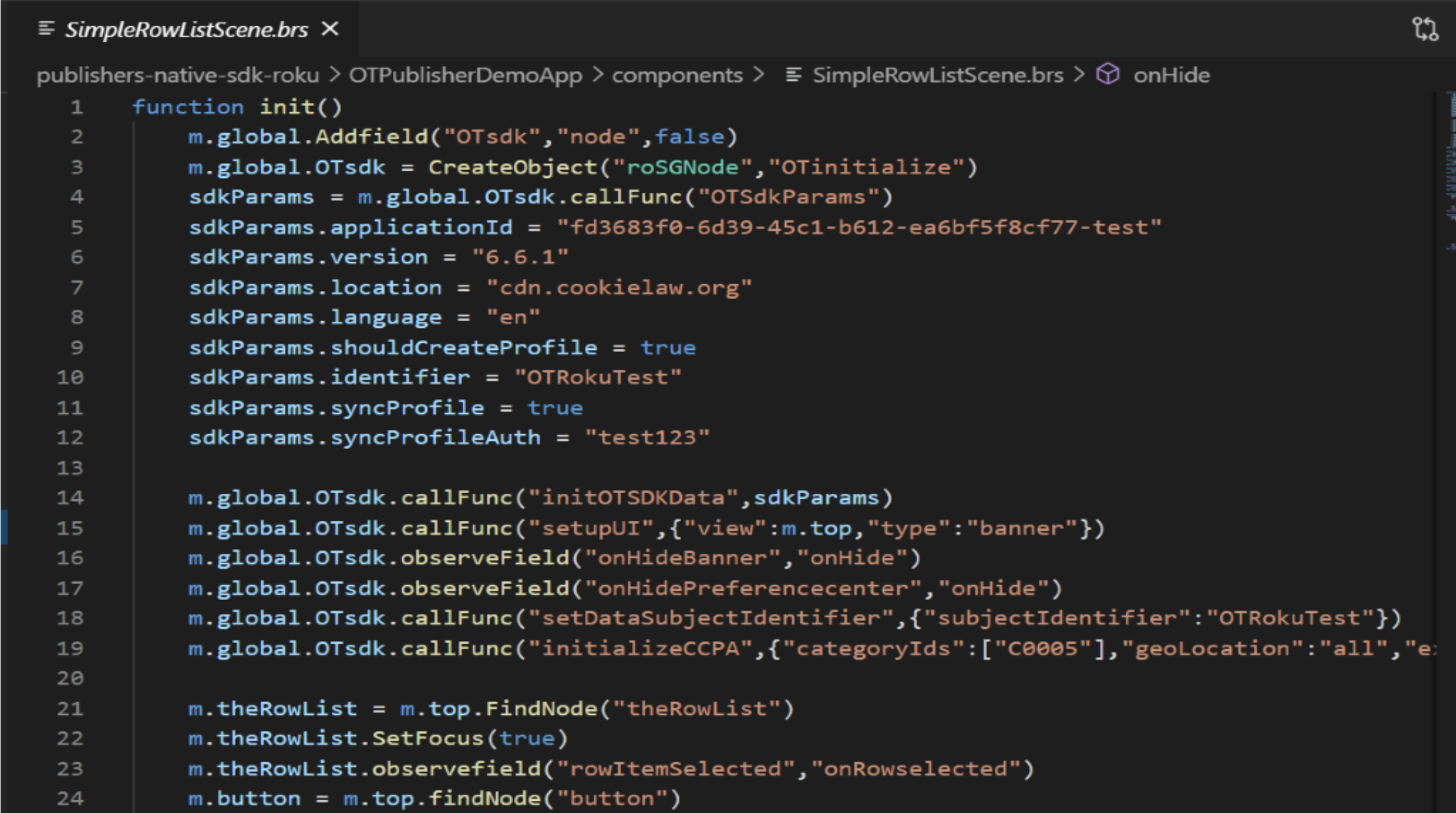 - Once we create the OTsdk init(), the sdkParams values such as appId, location, language and version need to be set and call the public method initOTSDKData() in the OTinitialize.brs file. The declaration also prompts the SDK data download.