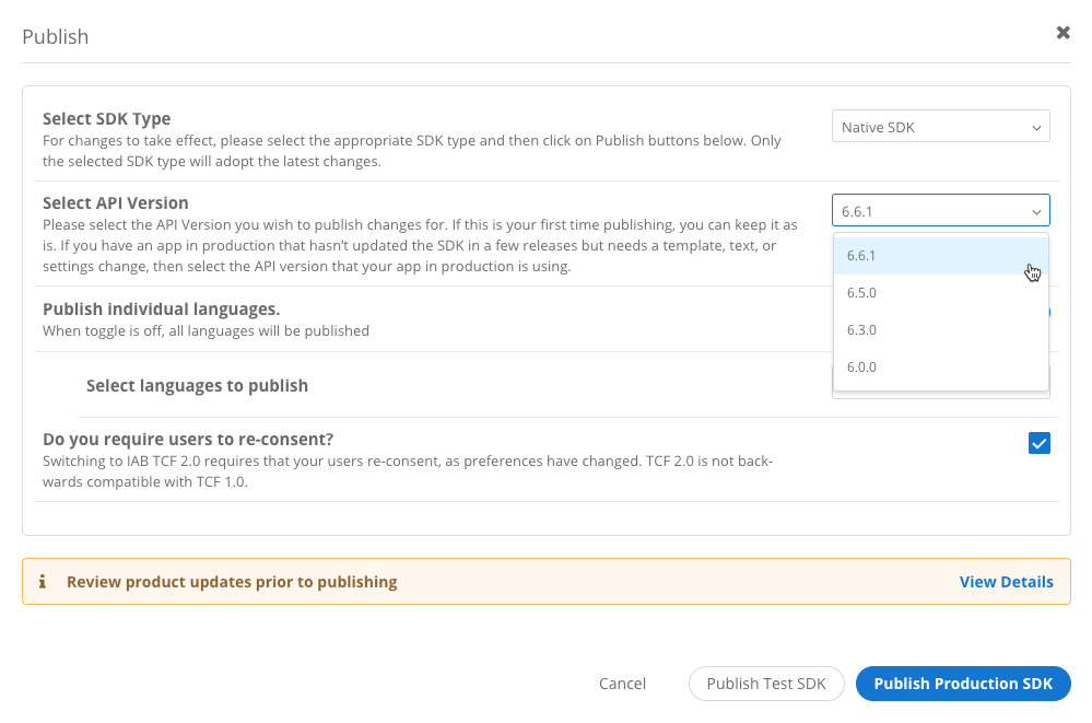 If your team needs to make a simple change to the CMP experience or reconsent users, this feature allows you to make those changes (based on what is supported below) and publish to the SDK version your application is running in Production.